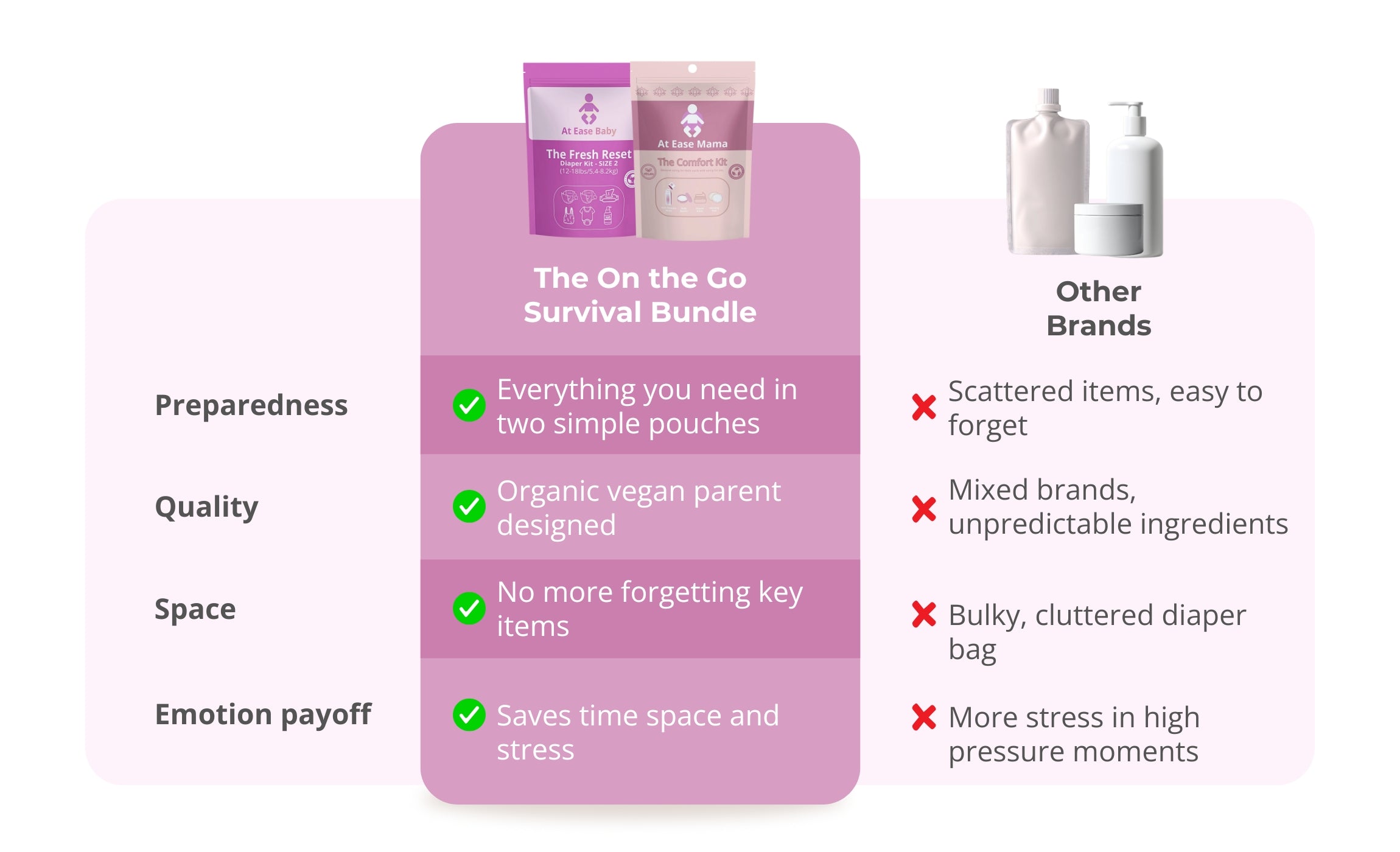 Most diaper bags are filled with loose items you hope you won’t need and can’t find when you do. When something happens, you’re digging, improvising, or wishing you packed differently.